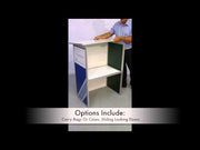 Comptoir d'affichage portable incurvé pliable, idéal pour les expositions, les événements et les salons professionnels. Les dimensions de ce comptoir sont de 1 050 mm de haut x 515 mm de profondeur et 1 072 mm de large. Cette unité est dotée d'une étagère centrale incluse. Les panneaux sont en PVC mousse blanc avec un cadre pliable en aluminium et un dos ouvert. Le plateau est verrouillé en position et est fabriqué en acier enduit de poudre avec un cadre en aluminium intelligent.